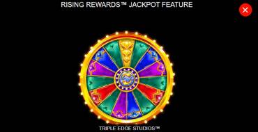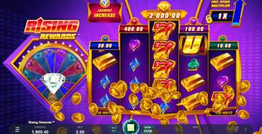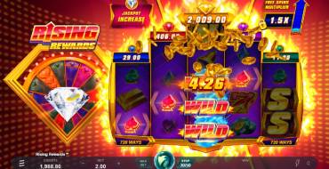 Слот Rising Rewards включает красочную игровую зону с 720 способами выигрыша на 5 барабанах с расположением символов 3-4-5-4-3. Само игровое поле сдвинуто чуть вправо, а слева размещается Колесо Джекпота (Jackpot Wheel). Различные уровни множителей размещаются над барабанами, и наиболее значительный из них расположен посередине.