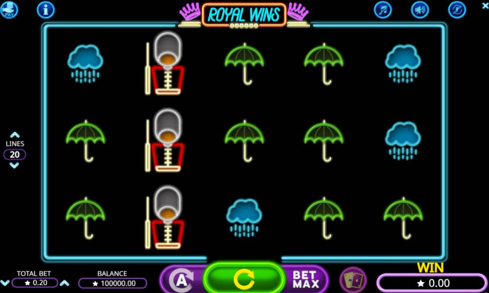 В конце 2017 года Booming Games выпустили Royal Wins. Это слот с необычным неоновым дизайном, посвященный культуре Великобритании. У него небольшое поле и выплаты по линиям. Количество линий можно выбирать. Максимальная выплата удивительно низкая — всего х200. Зато большой диапазон ставок: можно поставить до 200.00 за 1 спин. Есть риск-раунд, фриспины и Stacked Symbols.