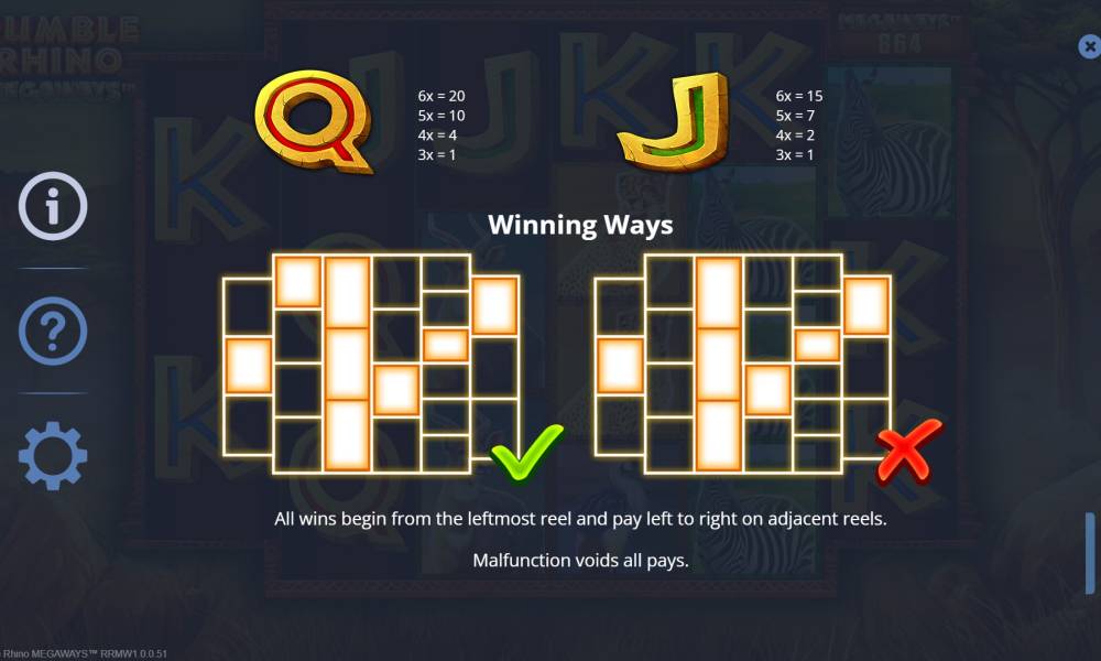 Игровой автомат Rumble Rhino Megaways от провайдера Pariplay имеет классическое поле, состоящее из 5 барабанов, количество символов в которых определяется механикой Megaways. Выплаты производятся по 86436 комбинациям.