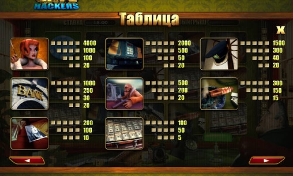 Safe Hackers – бесплатный игровой автомат с пятью барабанами, пятнадцатью линиями и тремя рядами символов на экране. В данной модели есть несколько тематических бонусных раундов, особые картинки и многие другие функции, о которых рассказывается ниже. Играть на игровом автомате Safe Hackers разрешается по любому количеству активных линий вплоть до пятнадцати. Поставить на каждую из них можно до пяти монет номиналом 0.05, 0.10, 0.25, 0.50, 1 или 2 евро. На спин принимается до ста пятидесяти евро. Оплачиваемые комбинации в видео-слоте Safe Hackers образуются из двух и более одинаковых картинок. Они должны выпасть рядом на активной линии, начиная с первого барабана. Выигрышной является только старшая комбинация на каждой линии. Остальные не оплачиваются. Для расчета суммы выигрыша ставка по линии умножается на коэффициент комбинации (максимальный равен х4000). Выплаты по всем комбинациям суммируются и тотчас переводятся на счет. Традиционной игры по шансам в видео-слоте Safe Hackers нет, но есть ее более интересный аналог, в котором можно побороться за крупные выплаты. Он описывается в разделе о бонусных раундах. Данные о теоретическом возврате игрового автомата Safe Hackers производитель обещает предоставить несколько позже.