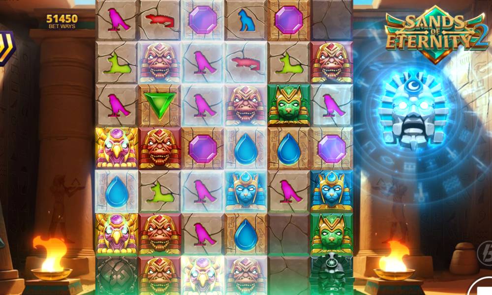 Sands of Eternity 2 — это видеослот с уникальной динамикой, включающей 6 барабанов и до 7 рядов. В начале игры используется сетка формата 6x3 с 729 активными линиями выплат, которые могут увеличиваться до 117 649 благодаря механике лавины. Каждый спин запускает последовательность событий, при формировании выигрышной комбинации участвующие символы исчезают, а на их место выпадают новые, что дает возможность получения дополнительных выигрышей в рамках одного вращения.