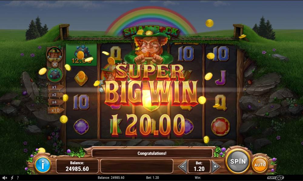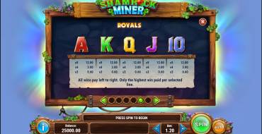 В онлайн-слоте Shamrock Miner довольно непривычный диапазон ставок для Play'n Gо, от 0.12 до 60 у.е.. Стоит заметить, что это лишь рекомендуемые ограничения, финальные выставляет казино. Символы делятся на три категории: 4 старших, 5 младших и 3 специальных. Учет комбинаций производится слева направо кроме как для бонуса Cash Prize. Игровое поле в обычном режиме состоит из 5 барабанов высотой в 4 ячейки, а во время фриспинов оно растет вверх. Общее количество линий для построения комбинаций может достигать значения в 27. Высокая волатильность ощущается довольно мягко и позволяет сорвать куш в х5000 от ставки.