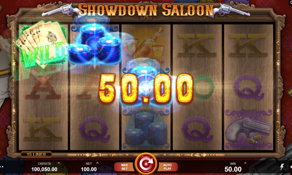 В Showdown Saloon использованы девять базовых картинок, джокер, скаттер, призовая функция Mystery Stacks, респины на особых условиях и бесплатные вращения с бонусами.