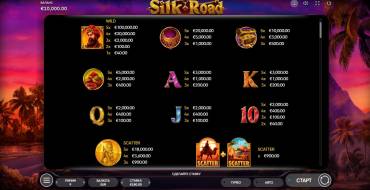 В Silk Road предлагается поле с 5 барабанами, 3 рядами и 9 линиями выплат. Выигрышные комбинации символов, кроме Scatter, должны располагаться на линиях выплат и соседних барабанах с крайнего левого ряда. Символ Scatter засчитывается с любого положения на барабане. Размер ставок варьируется от 0.01 до 200 монет. Появление на барабанах 2-3 и более одинаковых символов дает большие множители к выбранной ставке. Выпадение даже 1 символа Wild принесет выплату, а 5 уайлд подарят выигрыш с максимальным множителем х555 к ставке!