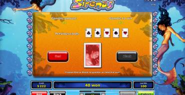 Sirenas – аппарат с пятью барабанами, десятью фиксированными линиями и пятнадцатью картинками на главном экране. Ставки по активным полосам всегда равны. На раунд принимается до десяти тысяч кредитов, но лучше уточнять диапазон непосредственно в интернет-казино. В слоте доступны разные виды простых и особых символов, игра на удвоение, бесплатные вращения, тематические бонусы и другие опции, рассматриваемые далее. Стандартные картинки формируют выигрышные цепочки на задействованных полосах слева направо. Для их образования нужны несколько одинаковых элементов, которые должны расположиться рядом друг с другом. Если комбинация полностью входит в состав более длинной последовательности, она не оплачивается. Выигрыши рассчитываются по ставке на линию и коэффициенту полученной цепочки. Он бывает в Sirenas от х5 до х5000. Эти величины перемножаются, а если комбинаций несколько, кредиты суммируются. Есть игра по равным шансам, в которой нужно угадать цвет карты, чтобы выплата удвоилась. Клиенты принимаются в ней участие по своему желанию. Подряд можно играть до определенного лимита, но при ошибке деньги уходят в казино. Об исключениях из общих положений и призах читайте в следующих разделах.