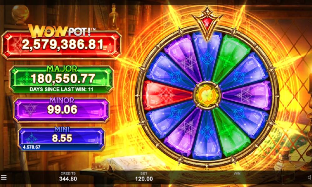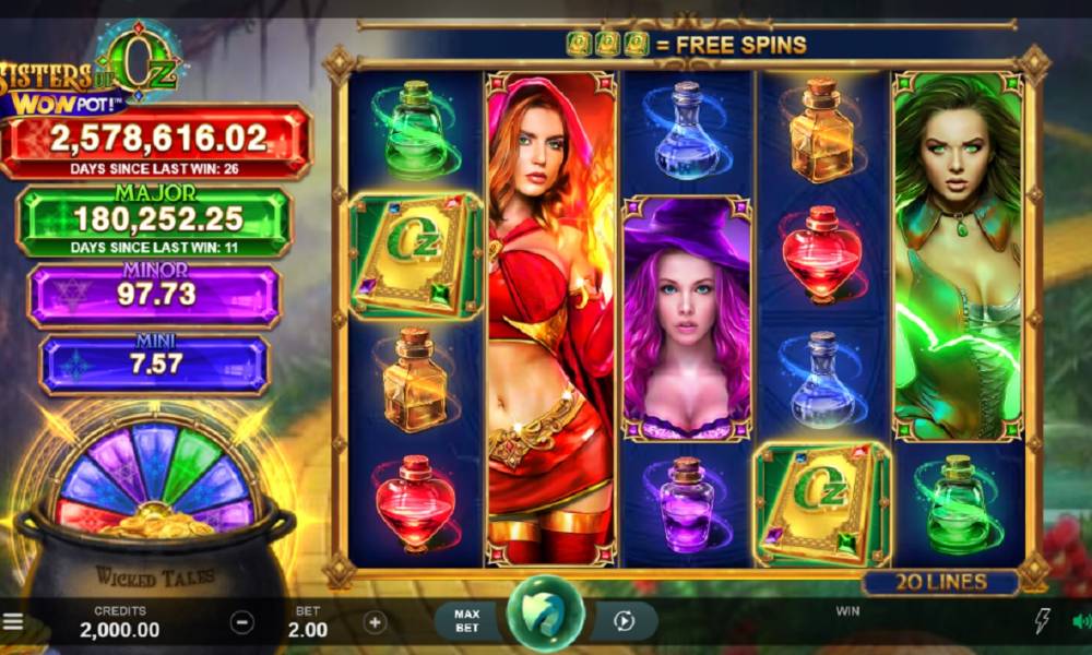 В слоте Sisters of OZ WowPot предусмотрены четыре прогрессивных джекпота, и за каждый “отвечает” одна из сестер. Каждая золотая унция, появившаяся поверх обычных символов, упадет в заветный горшок, и в любой случайный момент может открыться колесо джекпотов с разноцветными сегментами. После его вращения стрелка укажет на гарантированный большой выигрыш:
