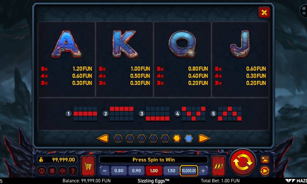 Игровое поле слота Sizzling Eggs от провайдера Wazdan представлено классическими 5 барабанами по 3 символа в каждом. Выплаты осуществляются по 5 линиям.