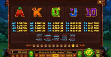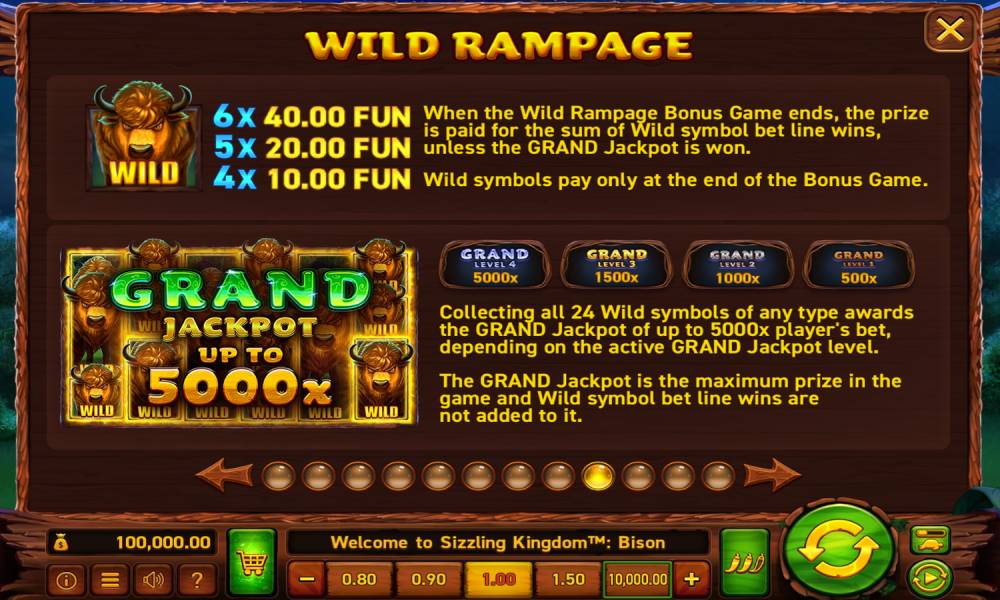 В слоте Sizzling Kingdom: Bison от Wazdan используется игровое поле размером 6x4 с 10 фиксированными линиями выплат. Выигрышные комбинации формируются при совпадении 3 и более одинаковых символов на активных линиях, начиная с крайнего левого барабана. В игре представлены символы диких животных, включая оленей, медведей и орлов, а также специальные символы, такие как Bison Wild символ, который может заменять любые другие символы, чтобы помочь создать выигрышную комбинацию. Символы Scatter (в виде серебряных монет) активируют фриспины. В зависимости от того, сколько Scatter символов выпало на барабанах (3, 4, 5 или 6), вы получите 8, 15, 25 или 100 бесплатных вращений соответственно. Во время фриспинов убираются символы с низкой стоимостью, что увеличивает шансы на крупные выигрыши. Размер ставки вы выбираете сами от 0.2 монет до 10000 монет. А максимальный выигрыш достигает аж 5000х от суммы ставки. Чтобы достичь этого, нужно активировать бонусную функцию Hold the Jackpot и заполнить все 30 ячеек игрового поля бонусными символами. В процессе можно собирать Level Up символы, которые повышают уровень Grand Jackpot. На четвертом уровне Grand Jackpot достигает своего максимального значения — 5000x от ставки.