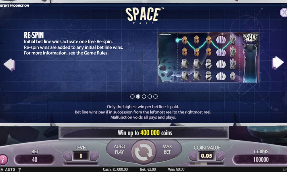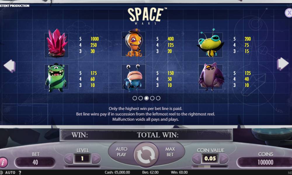 Глядя на персонажей нового видео-слота Space Wars («Космические войны»), сложно представить, что эти смешные инопланетяне могут вести боевые действия и убивать друг друга. Но забавные герои являются отнюдь не главным достоинством данной модели, которую нам предлагает компания Net Entertainment. Этот бесплатный игровой автомат также приятно радует некоторыми оригинальными разработками его создателей, в числе которых уникальные функции, особые символы, повторные спины и прочее. Обзор игры от портала Casinoz подробно расскажет вам обо всех ее достоинствах.