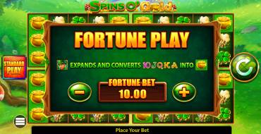Spins O' Gold Fortune Play — это онлайн-слот с 5 барабанами и 10 фиксированными линиями для выплат. Символы включают традиционные карточные номиналы и тематические изображения, такие как подковы, арфы и золотые горшки. Всего используется по 5 видов старших и младших знаков. Выигрышные комбинации формируются при совпадении одинаковых символов на активных линиях для выплат слева направо. Функция расширяющихся символов Wild, фриспины и режим Fortune Play добавляют разнообразие в игровой процесс, предоставляя дополнительные возможности для выигрыша. Ставку на спин пользователи могут делать от 0.1 до 10 евро.