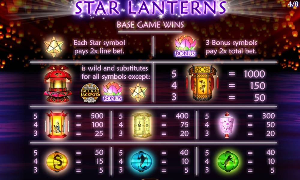 В онлайн-автомате Star Lanterns пять барабанов. Когда они неподвижны, на каждом видны по три картинки. Игра всегда ведется по двадцати активным линиям. На полосы разрешается делать равные ставки. Их диапазон устанавливается администрацией заведения, в котором вы будете играть на деньги. Помимо стандартных картинок, используются несколько специальных элементов, а также доступны бонусные опций, прогрессивный джекпот, бесплатные вращения и другие интересные особенности. Базовые изображения приносят выплаты, составляя на задействованных полосах непрерывные цепочки. Начинаться последовательности, сформированные из трех и более одинаковых картинок, должны только с первой колонки слева. Все исключения из этих правил рассматриваются далее в обзоре Star Lanterns. Для каждой из возможных комбинаций предусмотрены отдельные коэффициенты, варьирующиеся от х5 до х1000. При расчете выплаты эти показатели умножаются на ставку по одной линии. Если цепочек несколько по результатам раунда, кредиты суммируются. После начисления денег символы, которые образовали комбинации, исчезают, а их место занимают новые фонарики. Эта опция называется Floating Reels. Она может продолжаться, пока составляются цепочки. Дополнительных ставок функция не требует. Игра по равным шансам здесь отсутствует.