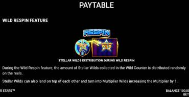 Wild Respin. Каждый раз, когда на поле появляется хотя бы 1 знак Wild, может сработать респин. Во время респина все накопленные Stellar Wild выбрасываются на случайные ячейки.