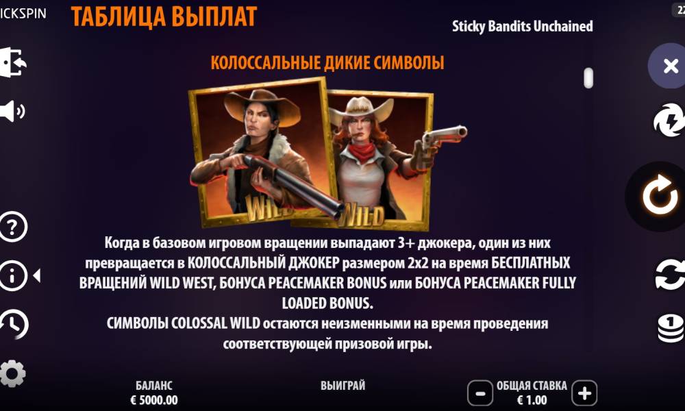 Sticky Bandits Unchained – новое воплощение знаменитой франшиз Quickspin Sticky Bandits, в которой действие происходит в городке Дикого Запада. Основные символы, они же персонажи игры представлены группой бандитов и бесстрашной дамой, которая им противостоит. С первых кадров и звуков я ощутила дух моих любимых вестернов. Дальнейший ход игры унес в глубины приключений и азарта. Очень важны Wild Bonus, запускающие серию бесплатных вращений, а далее только успевай считать выигрыш, который может дойти до х30 000 от ставки.