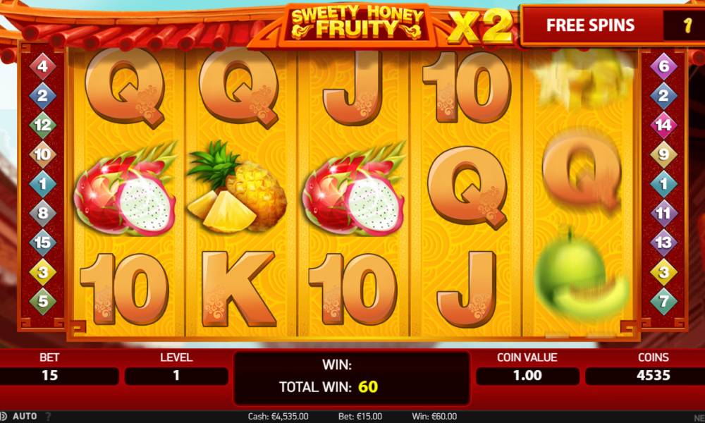 «Сладкий, медовый, фруктовый» слот – модель с пятью барабанами, пятнадцатью активными линиями для выигрышных комбинаций и тремя рядами иконок на основном экране. Количество полос не меняется.
