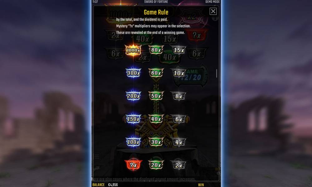 При первом запуске аппарата сразу предлагается ознакомиться с основными правилами. После прочтения стоит нажать кнопку «Start», чтобы перейти к игровому полю. На нем по центру расположен меч, а сверху множители. Осмотрев экран, можно сразу приступать к игре: