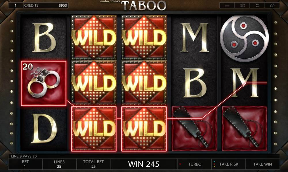 Конечно, все азартные игры казино предназначены исключительно для взрослых, но некоторые видео-слоты особенно хочется пометить значком «18+». Таким кажется игровой аппарат Taboo компании Endorphina. Мы не знаем, откуда черпали вдохновение разработчики, но на ум приходит нашумевший роман «Пятьдесят оттенков серого» и его не менее популярная кино-экранизация. В общем, любителям жанра BDSM посвящается…