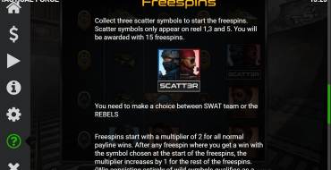 Если вы хотите запустить бонусную функцию бесплатных вращений, вам нужно будет получить символ разброса на первом, третьем и пятом барабанах одновременно. Когда это произойдет, вы автоматически выиграете 15 бесплатных вращений, а затем сможете выбрать свою команду - так что вам придется решить, хотите ли вы быть повстанцем или членом спецназа.