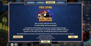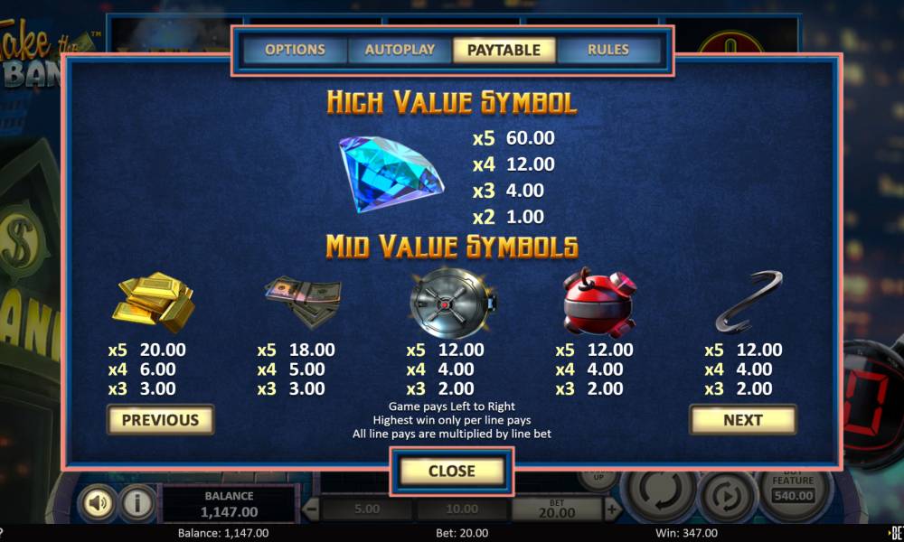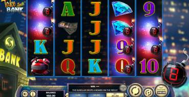 В игровом аппарате Take the Bank пять барабанов и двадцать ячеек для символов на основном экране. Активных линий семьдесят пять, но ставка не привязана к полосам. На спин можно ставить от двадцати центов до двадцати евро.