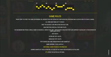 Игровая сетка слота имеет формат 5х4. Выигрышные комбинации составляются от левого края к правому от трех символов подряд. Всего в игре используется по 4 вида низко- и высокооплачиваемых знаков. Они составляют цепочки на 20 фиксированных линиях для выплат. Диапазон ставок на спин — 0.2-20 евро. В онлайн-слоте пользователи могут выиграть фриспины, которые будут сопровождаться бонусными функциями. Максимальный приз составляет х3000 от ставки.