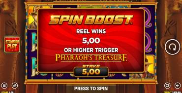 Spin Boost — это бонусная функция, во время действия которой все ставки будут выше в 5 раз. В течение игры, если пользователь получает приз х5 от поставленной суммы или больше, запускается Pharaoh's Treasure. На поле появляются несколько сундуков. Открыть нужно только один. Внутри может быть 5, 7, 10 фриспинов или «Collect», что означает просто получение приза за раунд.