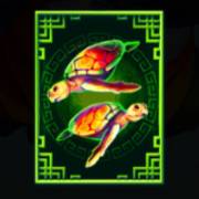 На барабанах изображены обозначения игральных карт, рыбки, птички, черепахи, обезьяна и павлин. Иконки стекированные, поэтому одинаковые картинки часто выпадают длинными вертикальными стеками.