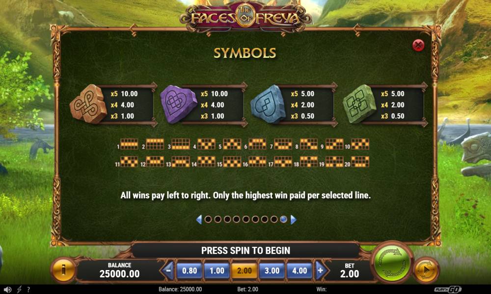 Игровой автомат The Faces of Freya от провайдера Play'n Go имеет классическое игровое поле из 5 барабанов по 3 символа в каждом. Выплаты производятся по 20 игровыми линиями.