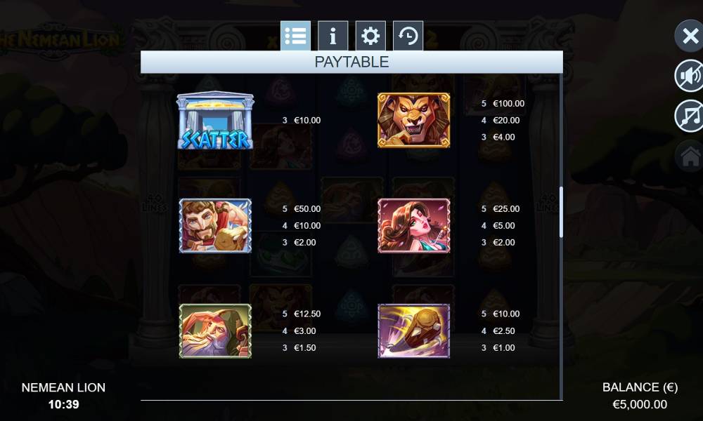 The Nemean Lion — это слот с 5 барабанами и форматом игрового поля 5х5. В нем можно делать ставки в диапазоне 0.2-200 евро и надеяться на крупные выигрыши, вплоть до х25000. Призы даются за выпадения одинаковых символов от 3 до 5 штук на фиксированных линиях выплат (40 штук) слева направо подряд. Игра использует 4 младших и 6 старших знаков. Есть и оплачиваемый символ Scatter, запускающий фриспины. Также помогает знак Wild, благодаря которому пользователи могут рассчитывать на составление более долгих цепочек. Провайдер добавил Multipliers, которые нужно собирать и активировать, чтобы они увеличивали выплаты за комбинации.