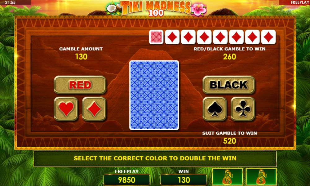 В слоте имеется игра по шансам, благодаря которой можно увеличить выигрыш. В ней вам нужно угадать цвет или масть закрытой карты.