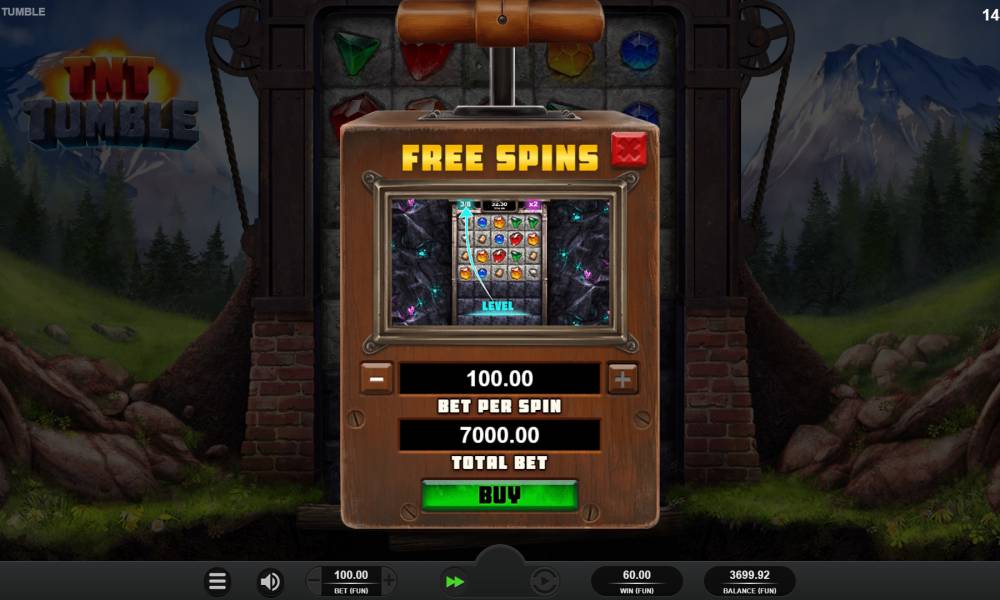 Ставка принимается на раунд. Она кратна десяти. В бесплатной демо-версии от разработчика предусмотрен диапазон от 0.10 до 100 евро. Играя в TNT Tumble на деньги в онлайн-казино, уточняйте лимиты на месте.