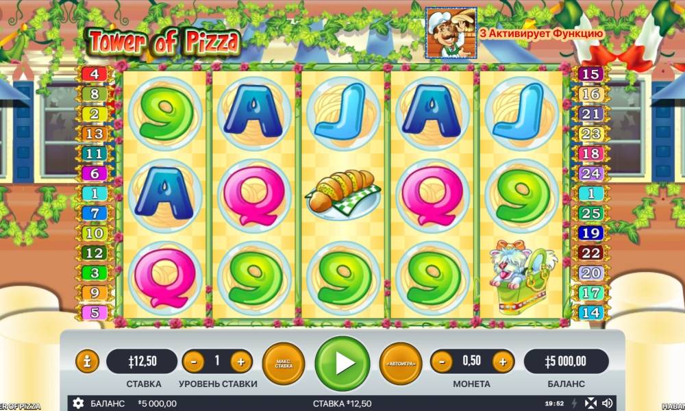 Игровое поле у слота Tower of Pizza от провайдера Habanero имеет вид 5х3 с 25 линиями. Их число можно менять.