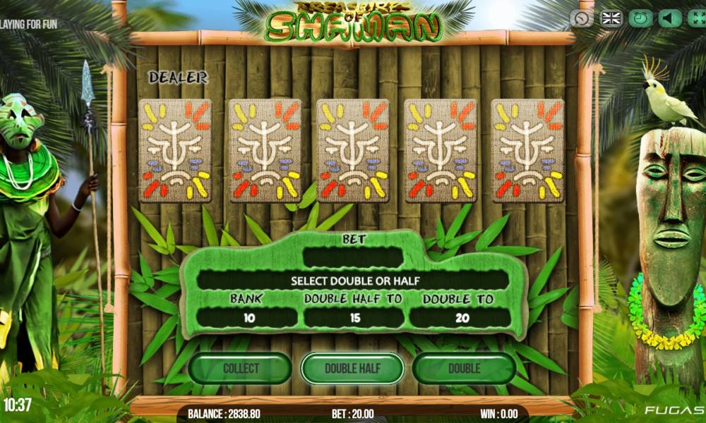 Вы сможете найти игру в переводе на свой родной язык, но даже без него разобраться в кнопках и окошках на панели будет вовсе не сложно. При выборе ставки укажите количество и стоимость условных чипов. Можно задействовать сразу десять монет одной кнопкой. Число активных полос не меняется. Кнопка игры на удвоение активируется, как только вам начисляется выплата. В отдельном окне можно поставить на кон 100% или 50% выигрыша. Карта дилера открывается, когда вы дадите согласие на участие в игре. У автоматического режима доступны многочисленные настройки лимитов. Играя вручную, можно сразу останавливать барабаны. Таблица состоит из нескольких страниц с коэффициентами, правилами, схемой линий и другой информацией. Скачивать игровой автомат Treasure of Shaman не нужно. Запускайте его в браузере на компьютере или в мобильной версии на смартфоне.