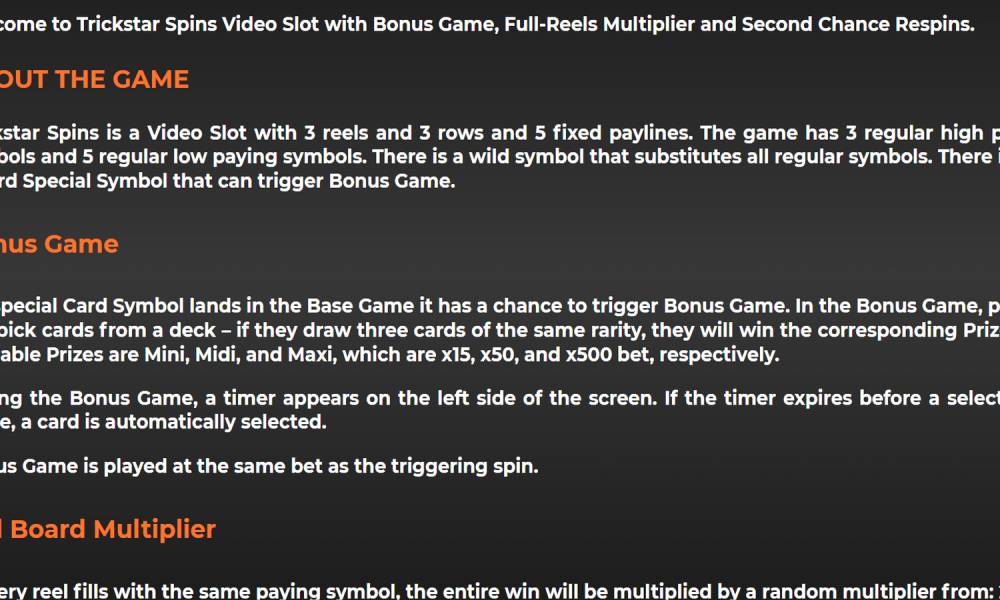 Провайдер Yggdrasil Gaming выпустил Trickstar Spins в конце января 2025. Это слот с мультяшным дизайном, посвященным потусторонней тематике. У него маленькое поле — 3х3. Бонусный функционал тоже небольшой: бонусов мало, и срабатывают они редко. Есть 3 размера джекпотов: х15, х50 и х500. Лимит по выигрышу составляет х800.