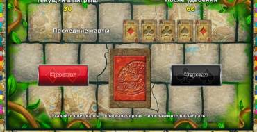 В видео-слоте Two Mayans есть классическая игра на удвоение. Вам нужно угадывать цвет закрытой карты. Если ответите правильно, общая выплата за спин увеличится в два раза. Если ошибетесь, то потеряете выигрыш. Количество удачных попыток в одном раунде ограничивается правилами казино.