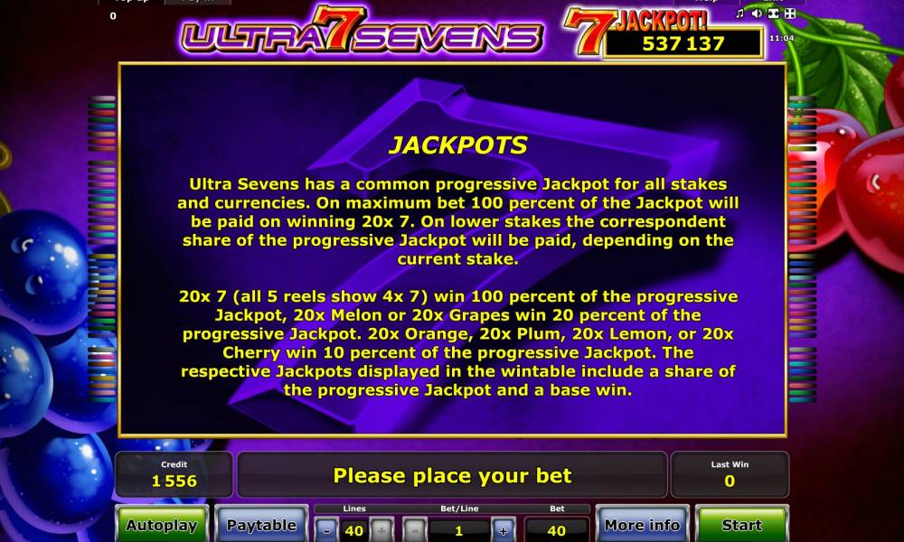 Компания Novomatic продолжает выпускать разнообразные онлайн-версии так называемых fruit machines, то есть игровых автоматов, на экране которых изображены всевозможные фрукты и ягоды. Очередной такой моделью в портфолио известного производителя софта для казино стал видео-слот «Ультра-семерки», которому посвящен данный обзор от Casinoz. Он интересен, конечно же, не тематикой, а наличием прогрессивного джекпота и других опций геймплея.