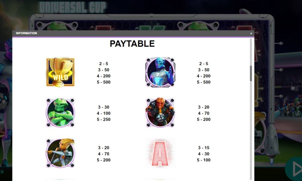В слоте можно отключить фоновую музыку и весь звук, активировать турборежим и выбрать размер окна. Скачивать Universal Cup не придется. Таблица выплат и правила опубликованы в едином окне. Его можно прокручивать вниз.