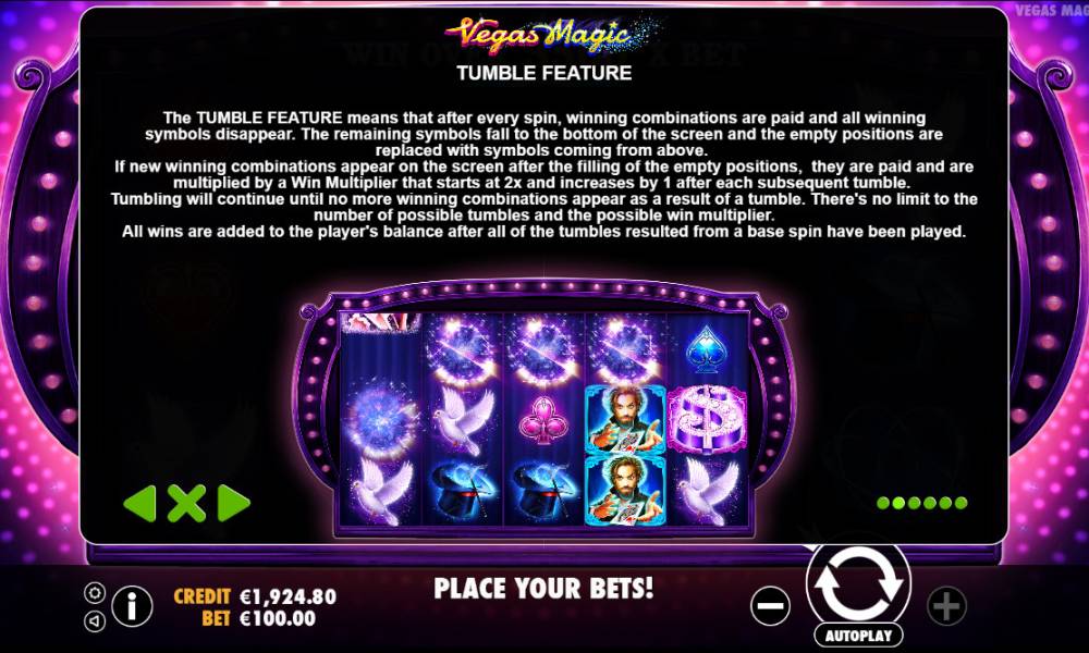 Любая выигрышная комбинация запускает Tumble Feature. Подробнее о бонусе, типах символов и исключениях из правил рассказывается ниже в обзоре Vegas Magic от Casinoz.