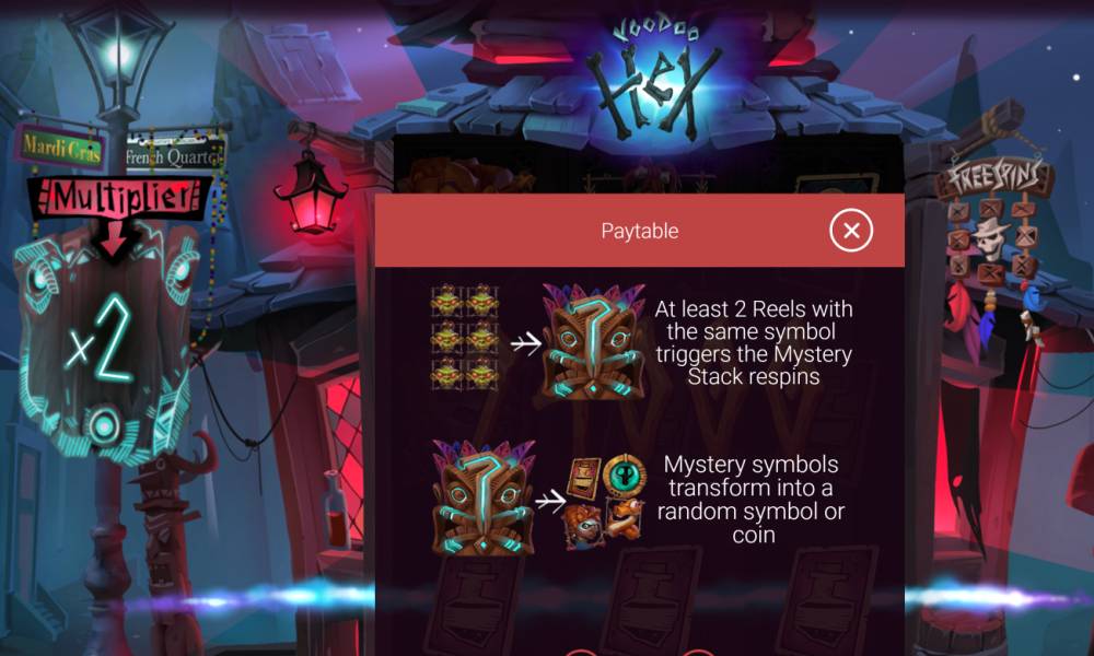 Игровое поле Voodoo Hex представляет собой сетку 3x3 с 5 выигрышными линиями. Счастливые комбинации формируются при совпадении трех одинаковых символов слева направо. Диапазон ставок варьируется от 5 до 10 000 монет за одно вращение. В игре предусмотрена функция Mystery Stack respin, а также бонусные раунды с фриспинами. Максимальный выигрыш — 10 000x от ставки.
