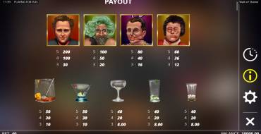 В слоте Walk of Shame 5 барабанов с 3 рядами на первом и с 4 на остальных. Линий для выплат 768 изначально, но при разрезании знаков их число увеличивается. Комбинации складываются из 3-5 одинаковых символов с первого барабана подряд. Пять младших знаков — это пустые бокалы из-под коктейлей, четыре старших — мужчины, которые хорошо погуляли. Провайдер добавил фриспины и множители, расширяющиеся дикие символы. Диапазон ставок в онлайн-слоте 0.2-100 евро. Выиграть максимально пользователи могут сумму в 9822 раза превышающую ставку.