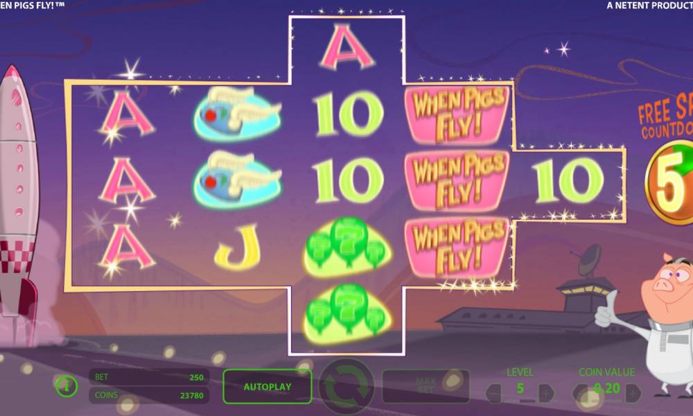 Фразу “when pigs fly” (дословно «когда свиньи полетят») можно перевести на русский поговорками «когда рак на горе свиснет» или «после дождичка в четверг», но нам пришлось остановиться на буквальном варианте перевода в силу тематики слота. Дело в том, что разработчики из компании NetEnt обыграли популярное выражение, представив, как мог бы выглядеть полет розовых хрюшек. Более того, они решили запускать поросят нужно сразу в космос.