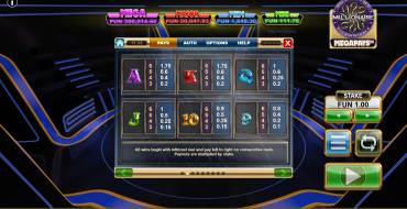 Слот Who Wants To Be A Millionaire Megapays от провайдера Big Time Gaming имеет игровое поле с 6 барабанами до 7 символа в каждом. Выплаты производятся по 117649 возможным комбинациям.
