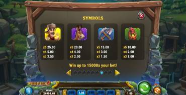 Wild Falls 2 — довольно интересный слот от провайдера Play'n Go, посвященный приключениям золотоискателя и его верного ослика. Путешествуя по живописным местам Америки им доведется потратить немало сил на пути к богатству, но максимальный выигрыш в х15000 от ставки стоит того.