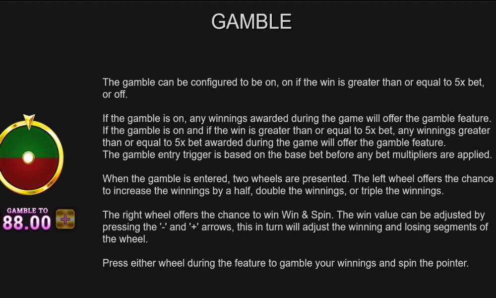 Gamble. Вверху игрового поля есть кнопка активирующая риск-игру. Если ее нажать, то любой выигрыш равный или более х5 от ставки, переносит игрока в этот раунд. Здесь есть два колеса. На одном можно выиграть запуск функции Wild Win and Spin, на втором — увеличение денежного приза за спин в 2 и более раза. Вращать можно их по очереди или только одно. Также в любой момент до сделанного выбора разрешено забрать свой приз и не рисковать. Если стрелка покажет на зеленый сектор, игрок получит приз, на красный — проиграет заработанное и вернется к барабанам. Сегменты на колесах указывают на вероятность выигрыша. Она может быть больше или меньше в зависимости от того, что на кону.