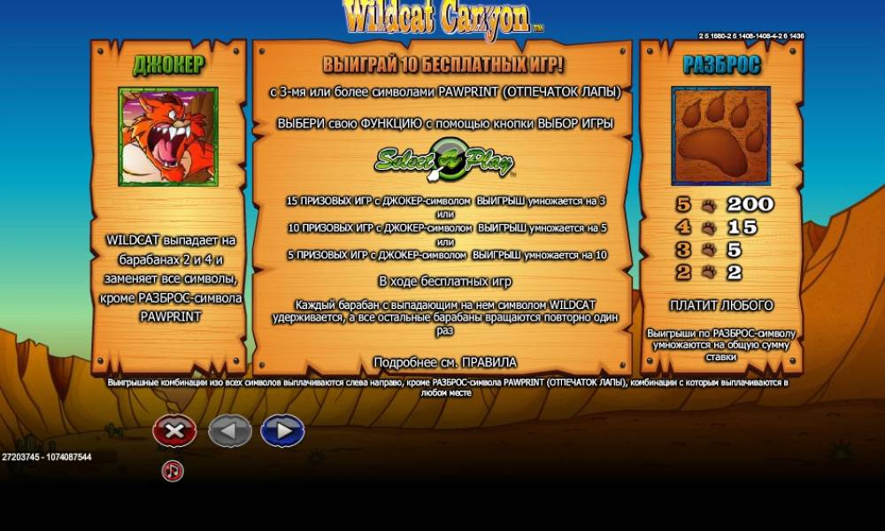 «Каньон дикой кошки» - это видео-слот с пятью барабанами, тремя рядами картинок на экране и двадцатью пятью линиями. Чтобы узнать, как линии располагаются на барабанах, откройте соответствующую страницу правил. Помимо обычных комбинаций, он предлагает особые символы, рискованную игру по шансам, повторные спины и бесплатные призовые вращения. Все опции рассматриваются ниже. Играть на игровом автомате Wildcat Canyon пользователи могут, активировав любое количество доступных линий. Ставка по одной полосе может варьироваться в диапазоне от пяти центов до пяти евро, а на раунд принимается до ста двадцати пяти евро. Для образования оплачиваемой цепочки требуется от двух или трех одинаковых картинок. Данные элементы должны расположиться подряд на активной линии, начиная с крайнего барабана слева. В каждой из подобных последовательностей выигрыш полагается лишь за старший вариант. Следовательно, на линии может быть лишь одна комбинация. Выигрыш рассчитывается по ее коэффициенту (до х5000), который умножается на ставку по линии. Общую выплату, начисленную за спин по всем комбинациям, можно не забирать сразу, а поставить на кон в игре по шансам. Здесь вам нужно будет наугад называть цвет или масть закрытой карты. Один из этих вариантов игрок выбирает сам. Если у вас получится угадать цвет, выплата удвоится. Если же вы верно назовете масть, она увеличится в четыре раза. Подряд можно играть не более пяти раз, но ошибаться нельзя. Данных о теоретическом возврате модели мы не нашли.