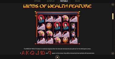 Winds of Wealth Feature. Функция срабатывает случайным образом после остановки барабанов и оплаты за сложившиеся комбинации. Ветер сдувает с поля все младшие символы. На их место опускаются другие. Каскад будет происходить до тех пор, пока на барабанах не останутся дикие и старшие знаки. После этого выигрыши суммируются и выплачиваются пользователю. Засчитываются комбинации слева направо и справо налево с крайних столбцов. Во время этой функции на поле не могут выпадать символы Scatter.