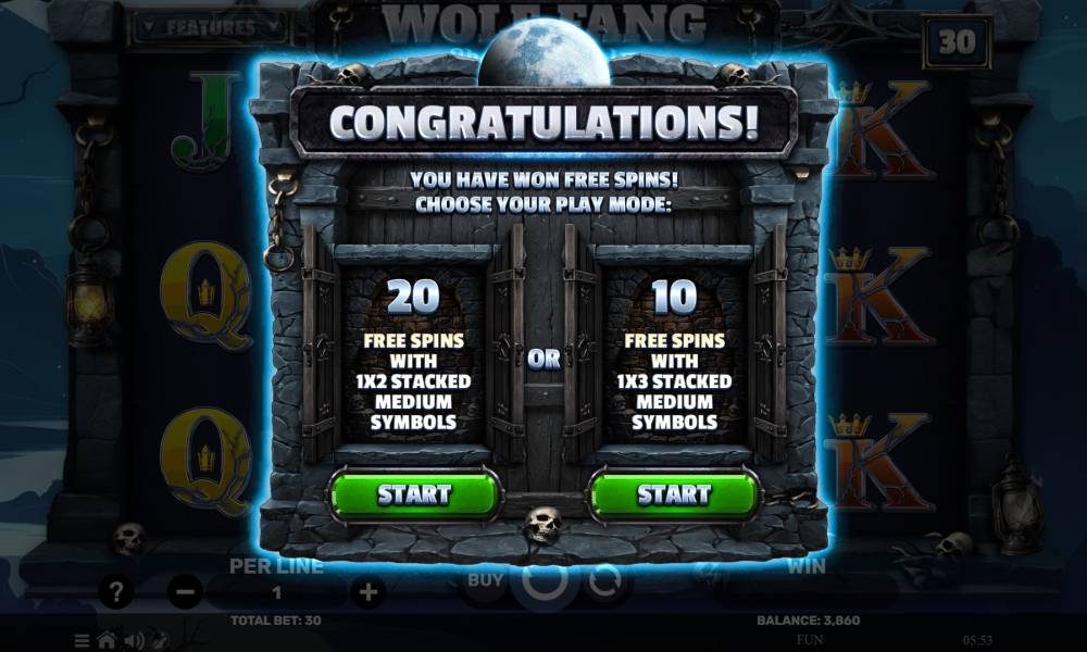 Для запуска фриспинов необходим триггер в виде 3 символов Scatter. После выбора бонуса в Choose Your Play Mode, все расчеты проводятся по таблице выплат, без дополнительных множителей, но с ретриггером приносящим еще 5 попыток.