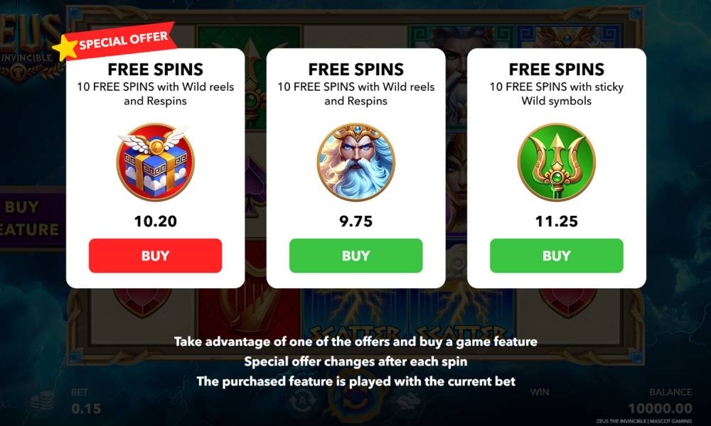 В Zeus the Invincible есть фриспины 2 видов. Отличия между ними есть в работе бонусных функций. Один пакет имеет Sticky Wilds и запускается 3+ символами Storm Scatter. Второй пакет имеет Sticky Wild Reel and Respin и запускается 3+ символами Lightning Scatter. Также оба пакета можно купить через Buy Feature. Если в простых вращениях выпадут 3 или 4 Scatter разных видов (например, 1 Lightning Scatter и 2 Storm Scatter) — фриспины не запускаются.
