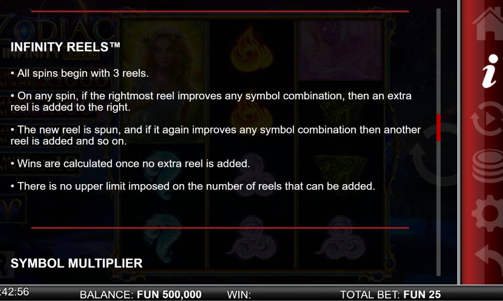Игровой автомат Zodiac Infinity Reels от провайдера ReelPlay имеет нестандартное поле. Каждая выигрышная комбинация будет увеличивать число барабанов на один. В каждом барабане же находится по 4 символа.