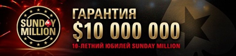 Для того, чтобы отпраздновать 10-ю годовщину проведения мероприятий флагмана своего продуктового ряда, турниров Sunday Million, крупнейший онлайн-покер-рум мира PokerStars проведёт специальный турнир с эксклюзивно увеличенным до 10 млн. дол. гарантированным призовым фондом (ГПФ), 1 млн. дол. из которых будет вручен чемпиону, в качестве 1-го приза.