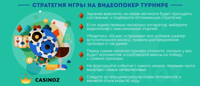 Раз уж вы оказались на этой странице, наверняка правила игры в видеопокер вам хорошо знакомы. Если нет, изучите их в статьях специального раздела Casinoz. Также вы должны освоить базовые стратегии для разных моделей. Эти условия обязательны для успешного участия в турнирах.